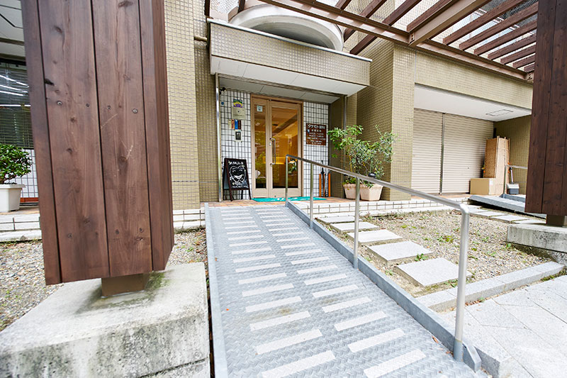 アイランドセンター駅から徒歩3分、オレンジ色の看板が目印です。入口はたくさんの植物に囲まれています。